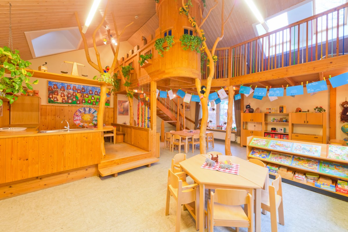 Durch helle, warm ausstrahlende Räume, Natureinbauten (2. Ebene), viel Lichteinfall und vielfältige Spiel- und Beschäftigungsmaterialien wird dies umgesetzt.